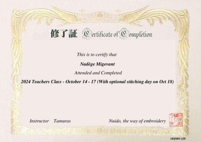 Brodeuses, brodeurs, Le savoir-faire de la broderie traditionnelle japonaise dite Nuidō se transmet selon une rigueur toute japonaise. Les enseignants doivent obtenir et renouveler un agréement tous les 3 ans auprès des maîtres japonais. Il permet, d’une part, d’utiliser les ouvrages et les fournitures du JEC (Japanese Embroidery Center) situé à Atlanta, en Georgie (USA).…