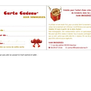 Choix des options Ce produit a plusieurs variations. Les options peuvent être choisies sur la page du produit Carte Cadeau NAM Broderies 10,00€ – 30,00€Plage de prix : 10,00€ à 30,00€